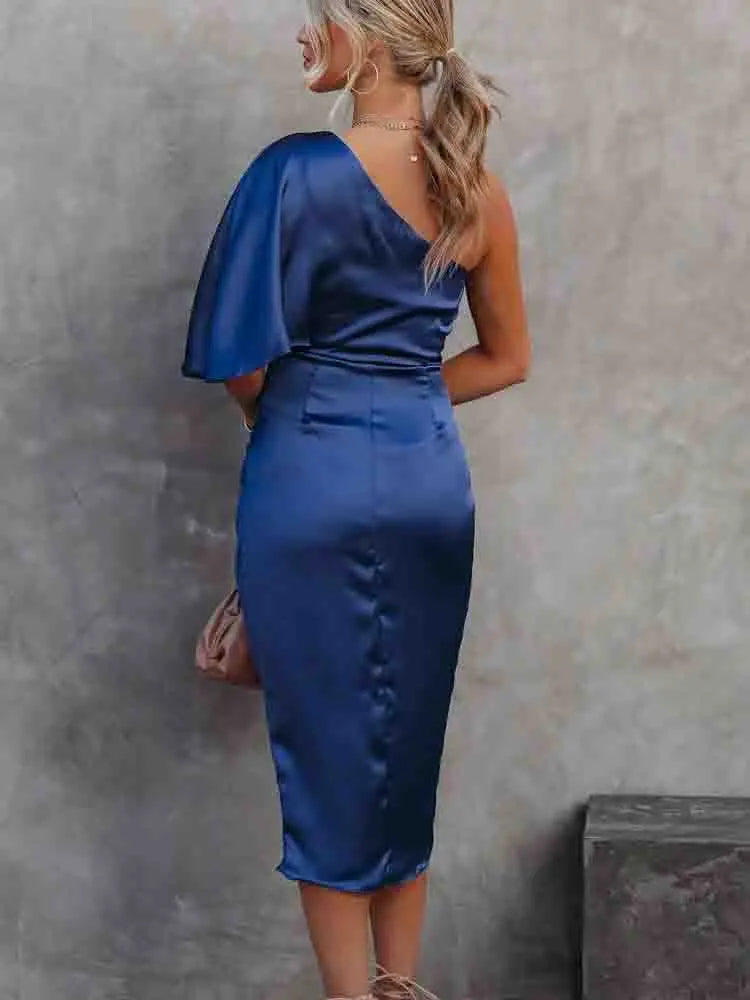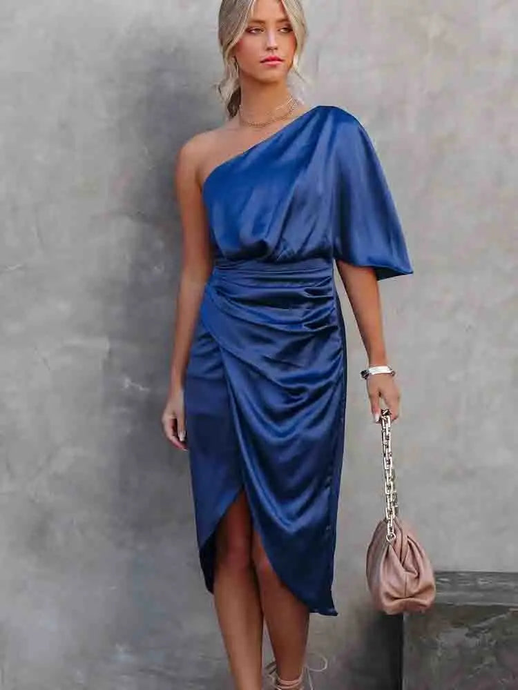 Asymmetrische satijnen jurk met blote schouder