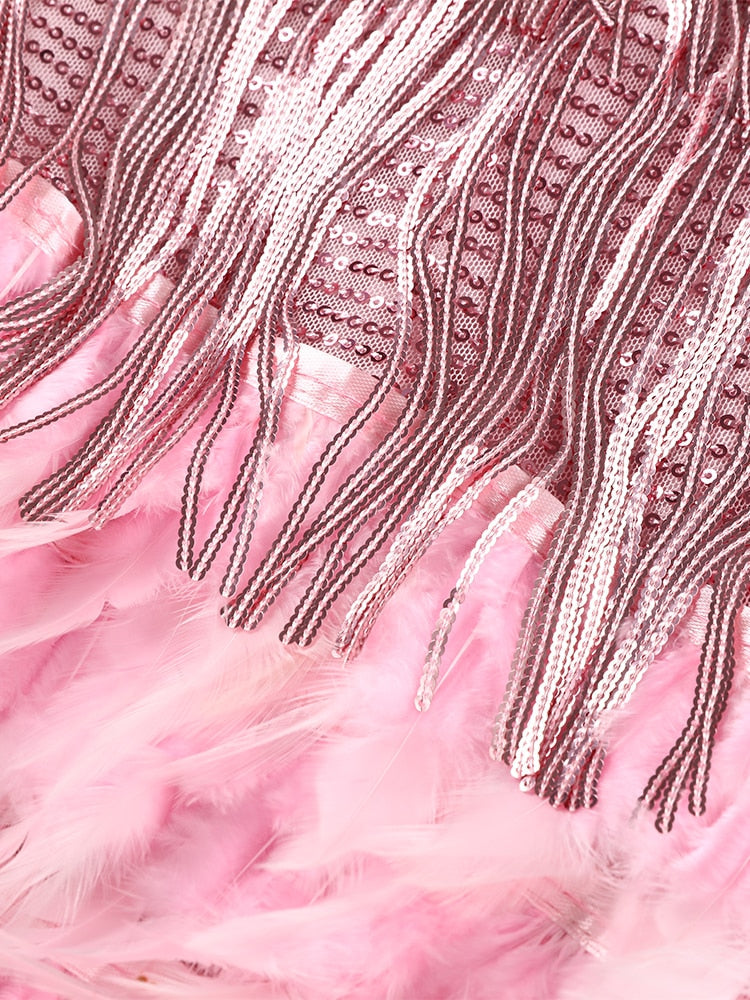 Adembenemende avondjurk die de aandacht trekt door unieke versieringen. Franjes geven de jurk beweging en elegantie, terwijl de delicate veren aan de onderkant haar een lichte en unieke uitstraling geven. Dunne spaghettibandjes en een aansluitende pasvorm benadrukken de figuur, waardoor het een opvallende styling is voor feesten, bruiloften of andere speciale gelegenheden. Ideale keuze voor vrouwen die zich speciaal en elegant willen voelen.