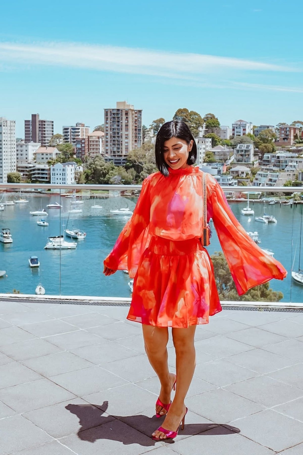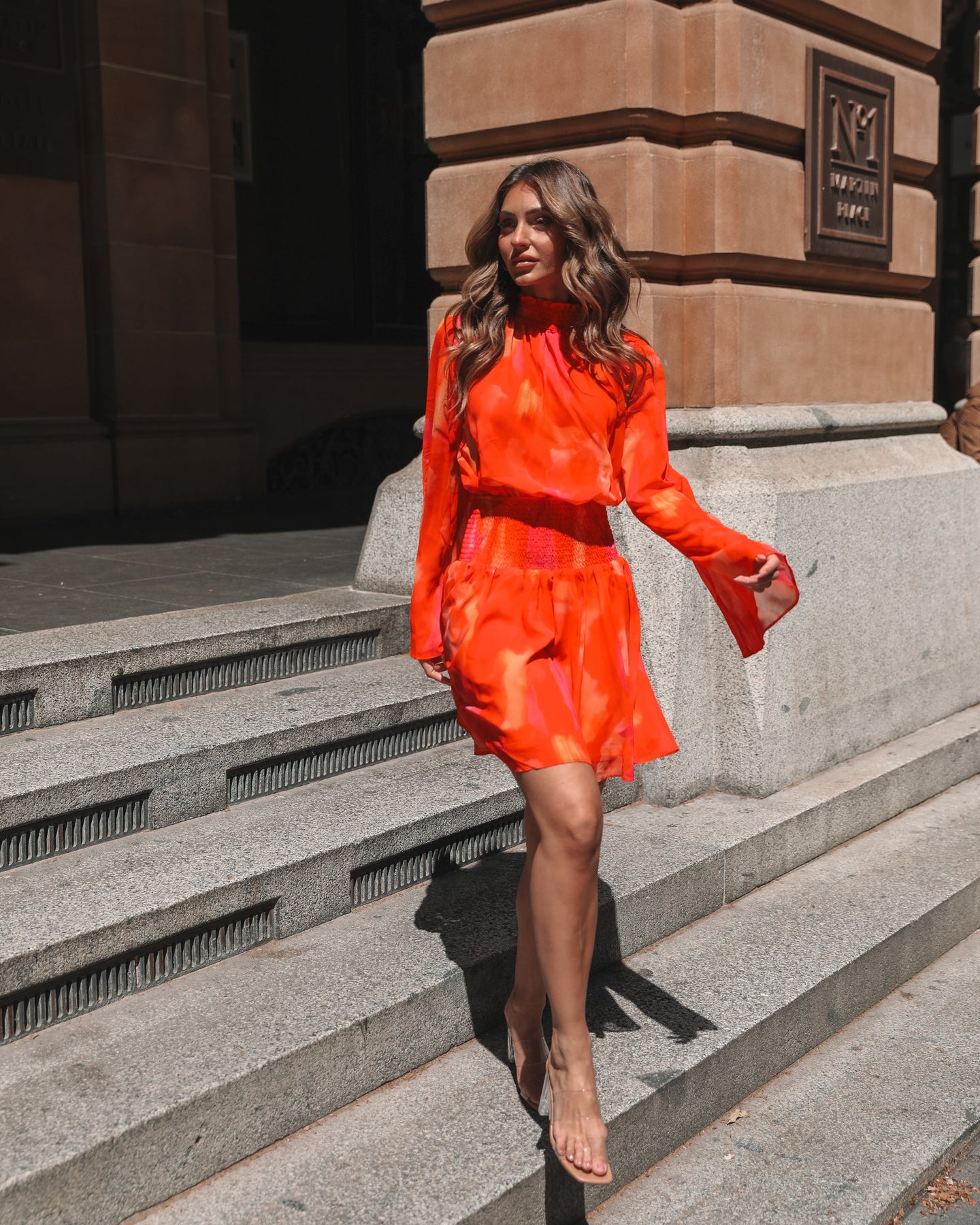 Dames | Daenerys Jurk | Oranje Print | Hoge Halslijn | Trompetmouwen | Mini Lengte