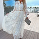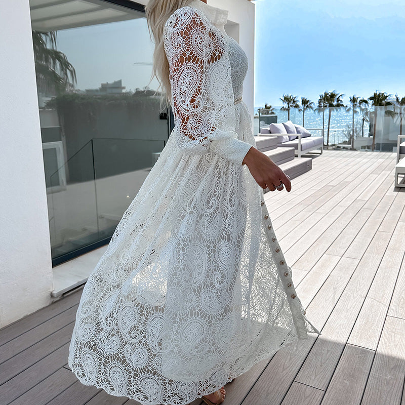 Trek de aandacht met deze prachtige lange kanten jurk, die traditionele elegantie combineert met moderne details. Deze creatie met volle mouwen is perfect ontworpen voor evenementen die een speciale uitstraling vereisen. De delicate kant maakt het zowel ademend als schitterend, terwijl de zorgvuldig geplaatste knopen een klassieke charme toevoegen. In de taille bevindt zich een subtiele riem die de figuur accentueert, en de maxi-lengte biedt een vleugje drama bij elke beweging. De jurk is ideaal voor feestelijke gelegenheden, romantische diners bij zonsondergang of als onderdeel van een garderobe voor luxe vakanties. In combinatie met zorgvuldig gekozen accessoires creëert het een onvergetelijke look voor elke speciale gelegenheid.