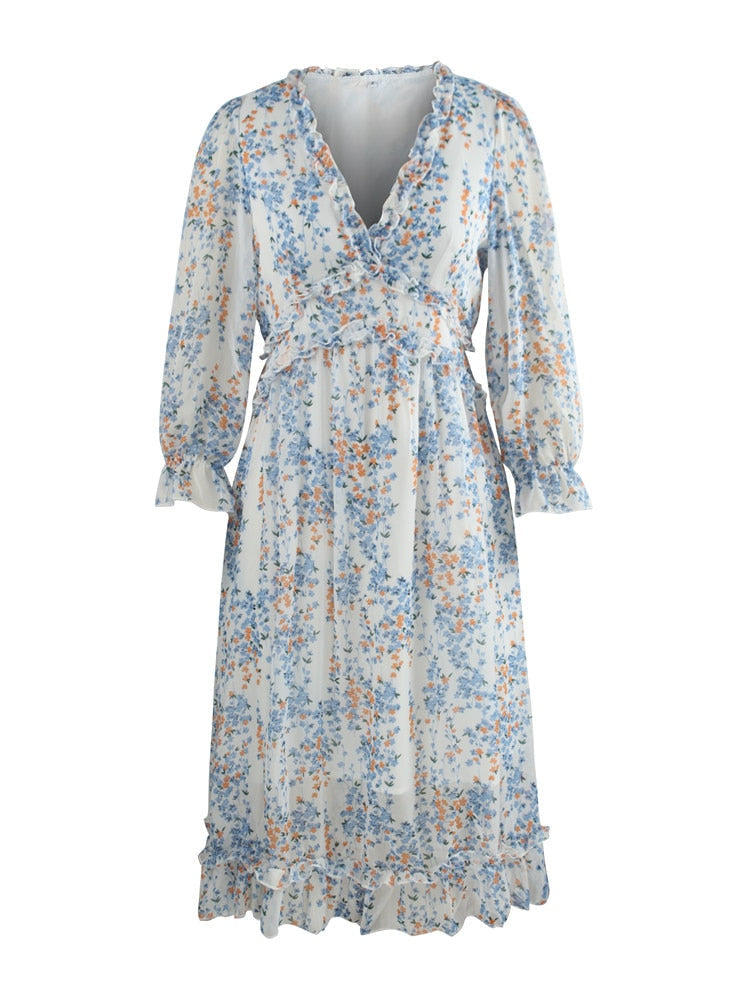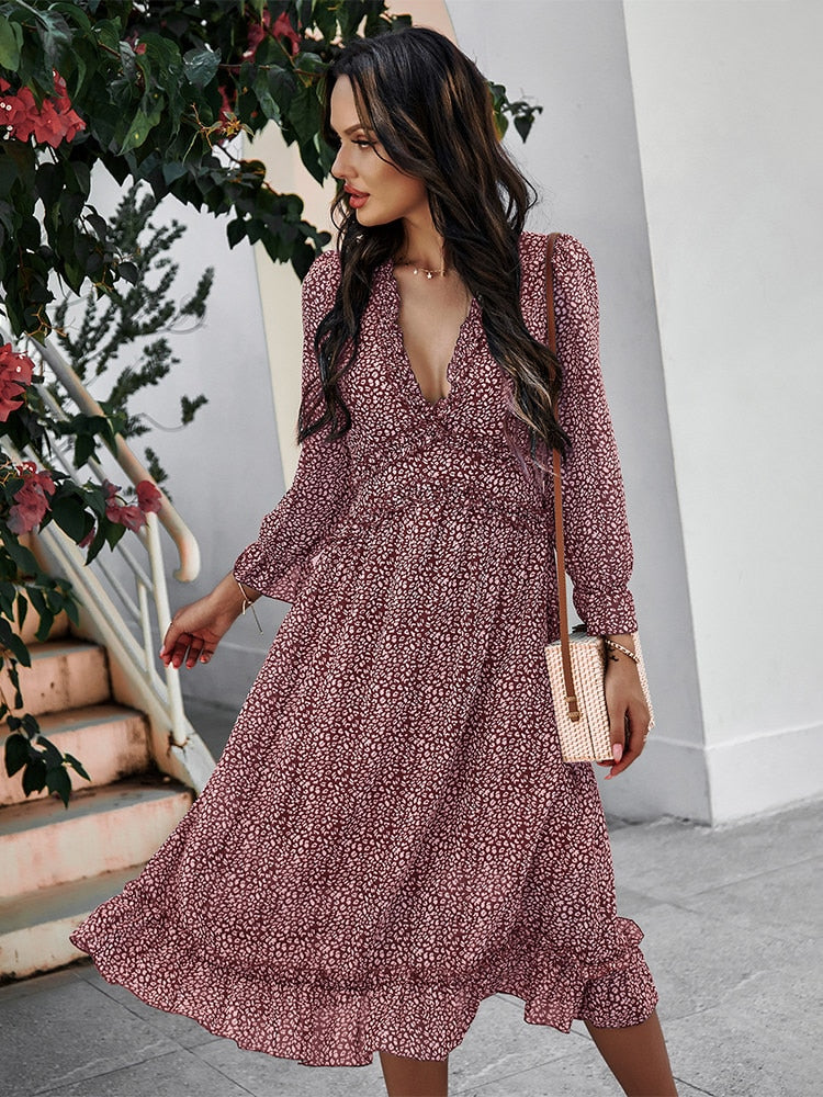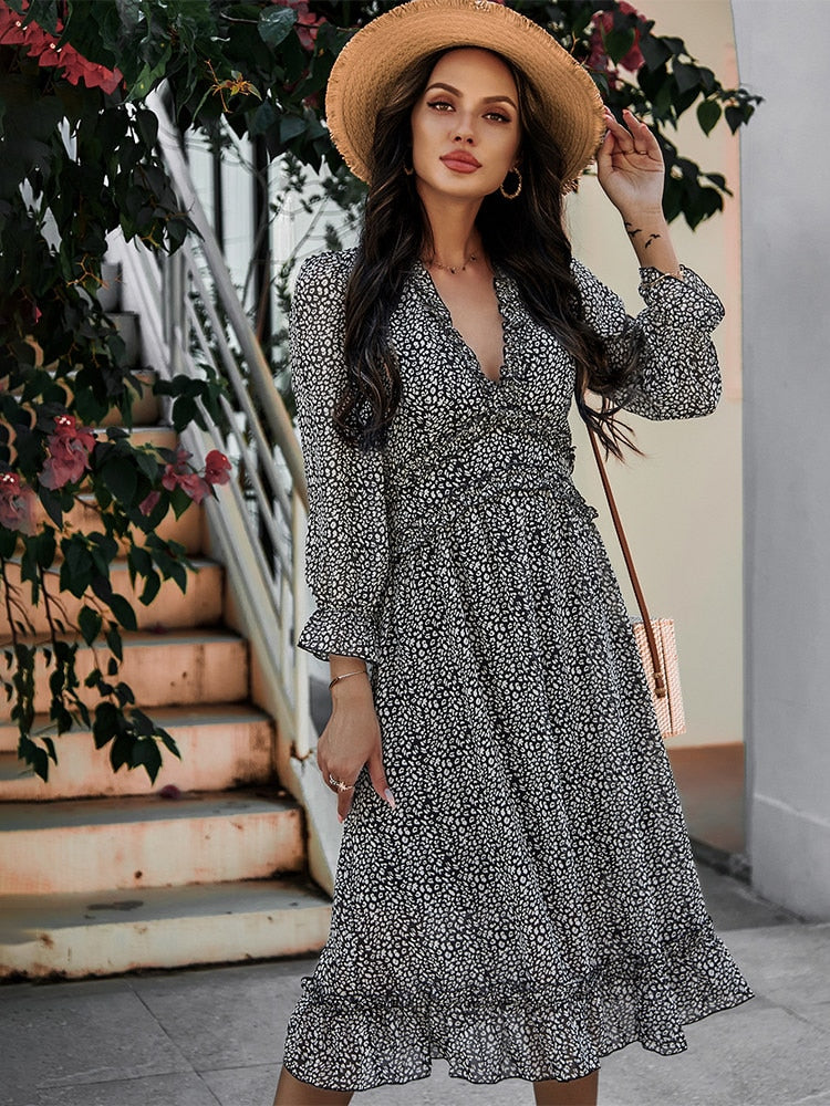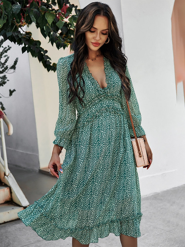 Benadruk je zomergarderobe met deze romantische midi-jurk, die de essentie van vrouwelijkheid en lichtheid belichaamt. De subtiele bloemenprint en delicate ruffles geven een ongedwongen charme aan elke beweging die je maakt. Gemaakt van ademend materiaal heeft de jurk een elegante V-hals, wat het de ideale keuze maakt voor warme, zomerse dagen. De midi-lengte maakt het veelzijdig - perfect voor een wandeling op het strand of een brunch met vrienden. Verkrijgbaar in verschillende kleuren, kun je de perfecte tint kiezen die het beste bij jouw stijl past. Combineer het met espadrilles of sandalen voor een informele, maar stijlvolle look.