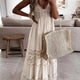 Verlies jezelf in de wereld van romantische elegantie met onze lange, witte jurk met ażurowe details. Perfect voor de zomer, deze jurk is de belichaming van vrouwelijkheid en tederheid. Het unieke ontwerp combineert subtiele ażurowe patronen met een lichte, luchtige stof, wat het een onmisbare must-have maakt voor het zomerseizoen. De bovenkant van de jurk is versierd met prachtige ażurowe elementen die zich vermengen met de vloeiende lijn van de volants aan de onderkant, waardoor de creatie een ongekende lichtheid en frisheid krijgt. De diepe V-hals en de onschuldige spaghettibandjes accentueren de schouders en decolleté, terwijl de lossere onderkant vrij naar de grond valt, wat zorgt voor een casual maar verfijnde uitstraling. Deze jurk is de perfecte keuze voor elke gelegenheid – van een wandeling op het strand, via zomerse tuinfeesten, tot avonduitjes. Combineer het met eenvoudige sandalen en je favoriete schoudertas voor een opvallende, maar ongedwongen look die alle blikken zal trekken.