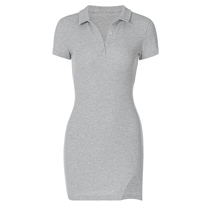Ontdek de veelzijdigheid van deze stijlvolle polo jurk met korte mouwen, perfect voor elke gelegenheid. Met een klassieke kraag en een elegante rij knopen, combineert deze jurk casual comfort met subtiele elegantie. Het asymmetrische detail aan de onderkant voegt een moderne twist toe, en de aansluitende snit accentueert prachtig de figuur. Gemaakt van zachte, elastische stof die de hele dag voor comfort zorgt. Verkrijgbaar in verschillende kleuren, is deze jurk perfect voor degenen die houden van eenvoudige, maar opvallende modeoplossingen.