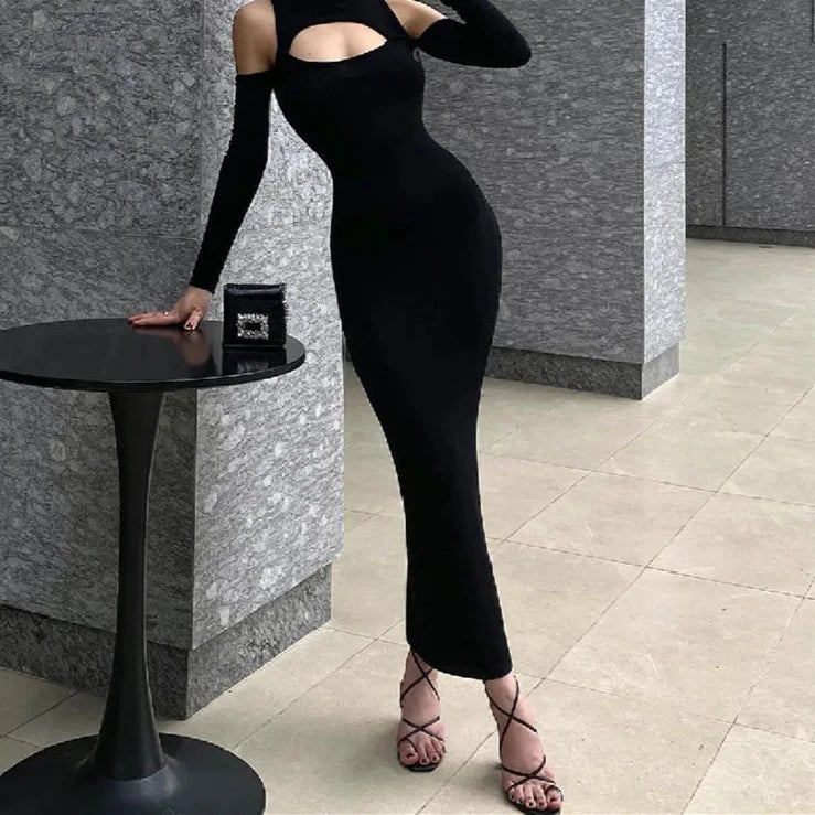 Benadruk je elegantie en sensualiteit met deze lange jurk met ontblote schouders en een uitsnijding bij de décolleté. Gemaakt van hoogwaardig materiaal, past de jurk perfect bij de lichaamsvorm en accentueert deze de rondingen. Lange mouwen met uitsnijdingen op de schouders en een opvallende uitsnijding bij de décolleté geven het geheel een moderne en gedurfde uitstraling. Perfect voor avondjes uit, feesten en speciale gelegenheden, deze jurk zorgt voor een elegante en sensuele look.
