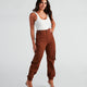 Herinner iedereen aan je mode-status! Deze hoge taille twill cargo joggers zullen zeker de aandacht trekken. Ze hebben een knoopsluiting aan de voorkant, een verborgen ritssluiting, riemlussen, vier zakken en elastische boorden. Maak de look compleet met een schattige henley crop top en mules.