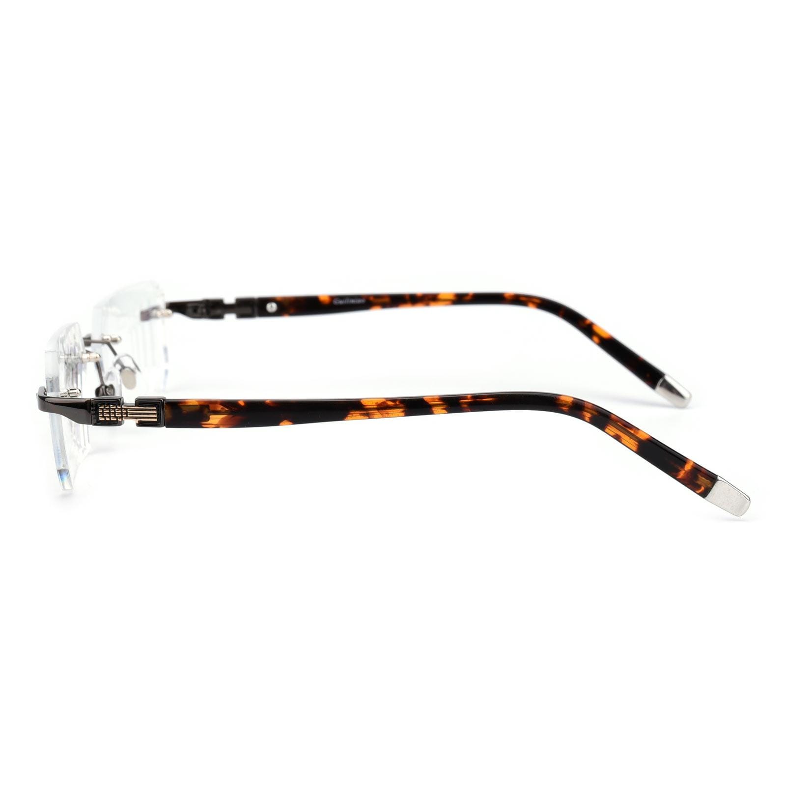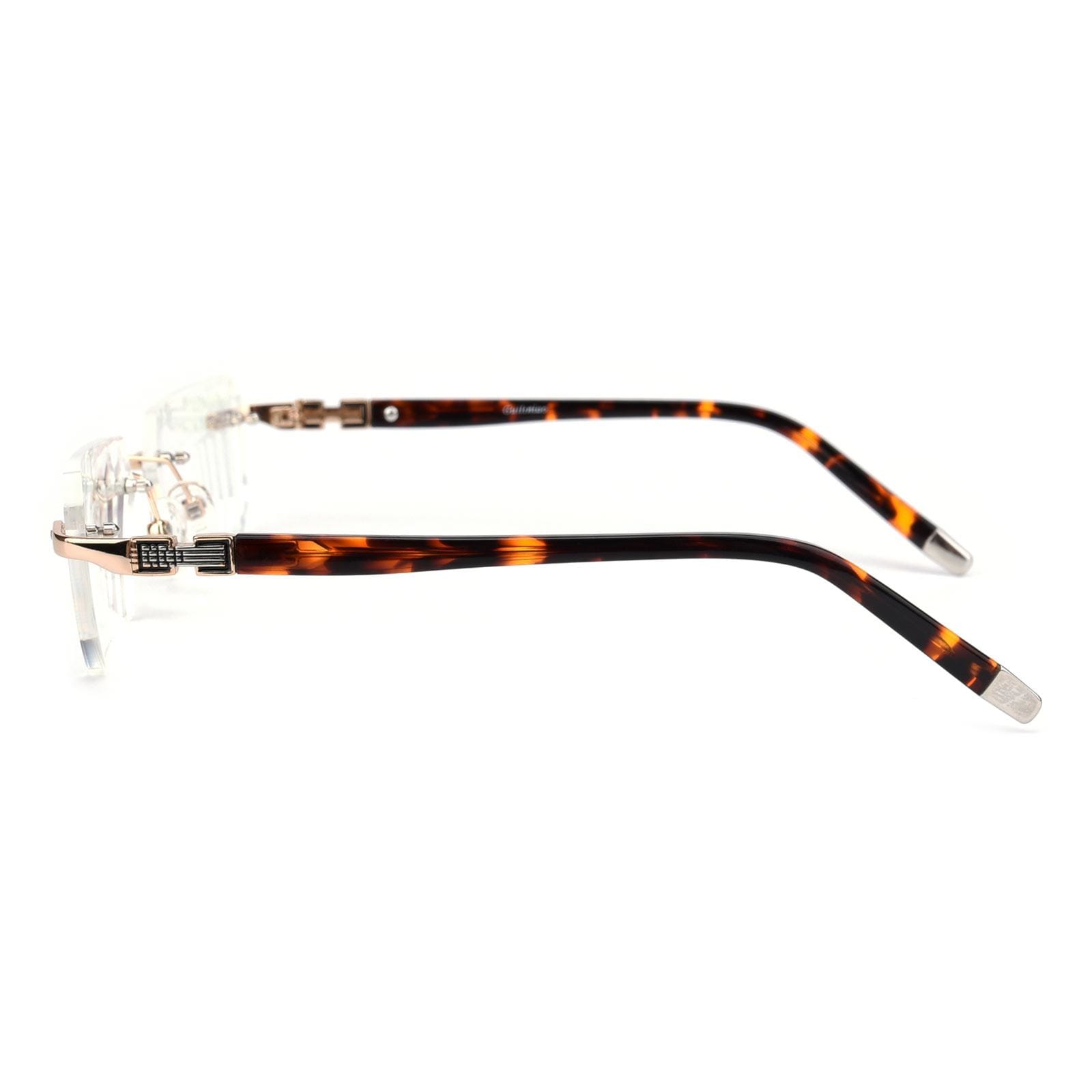 Ultra-light rimless glasses. These glasses are nearly invisible from the front when worn. The lenses can be cut in various shapes. There are four colors to choose from: brown, silver, black, and purple.