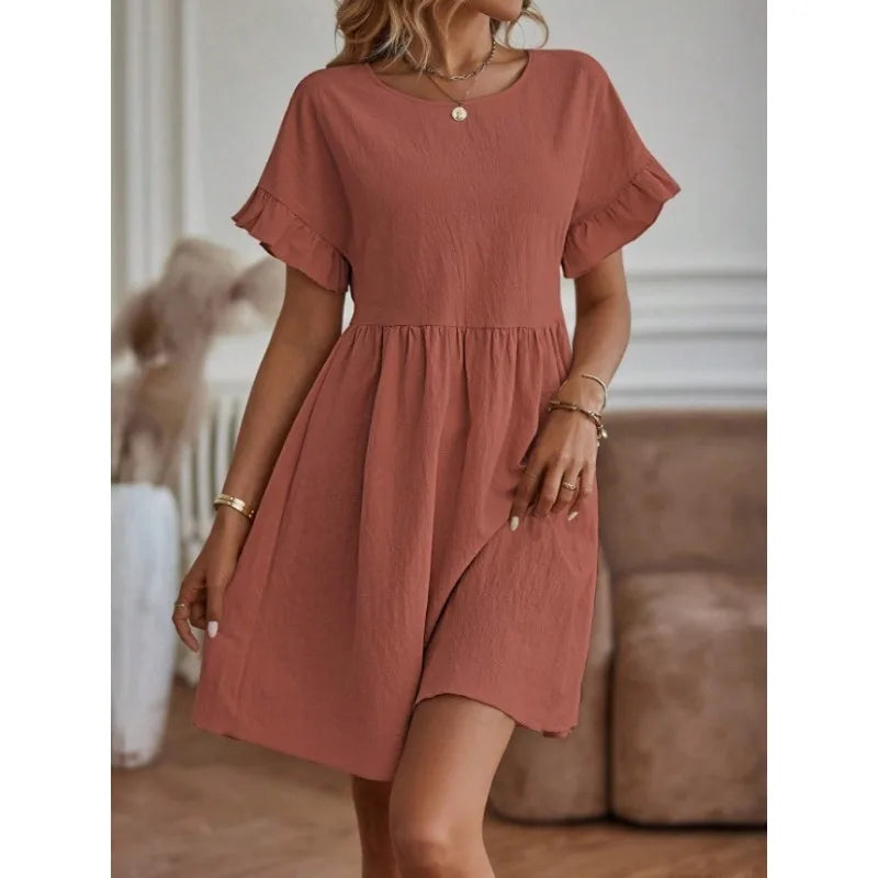 We present a cute and comfortable women's dress, ideal for warm days. The dress has a loose fit for comfort and freedom of movement. Short sleeves with delicate ruffles give it a girlish charm. The dress features a round neckline that subtly accentuates the neck, and the slightly flared hem creates a romantic and airy look. Made of a lightweight, breathable fabric, it's perfect for summer outings, walks, or gatherings with friends.