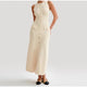 Stylish midi knit dress with a fitted silhouette, ideal for warmer days. This sleeveless dress features a high neckline and a decorative row of buttons along the entire length. Two faux flap pockets add elegance and a modern touch. The comfortable, stretchy fabric drapes perfectly and emphasizes your best features.