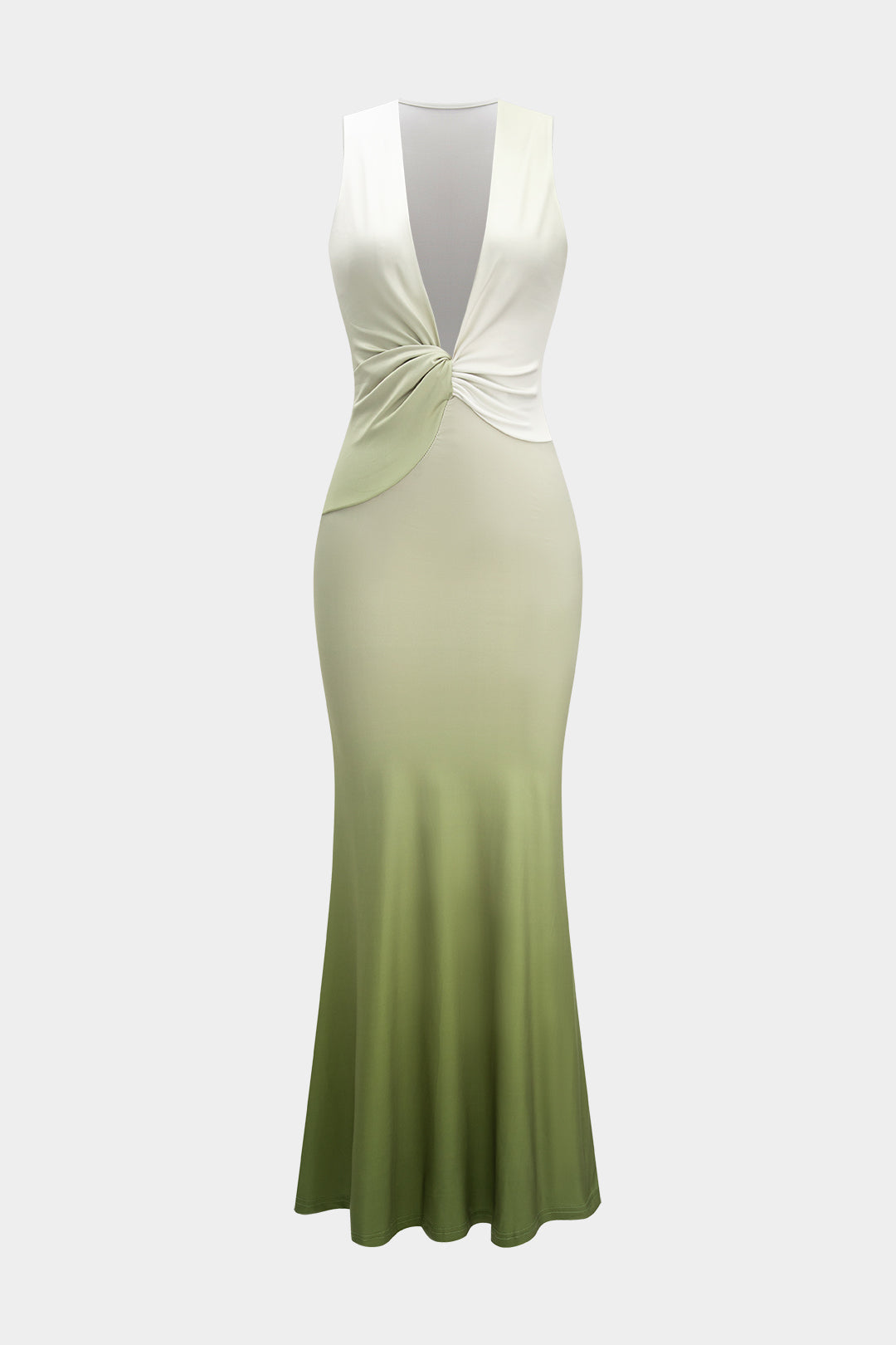 Satin Ombre Print V-Neck Ruffle Sleeveless Maxi Dress
