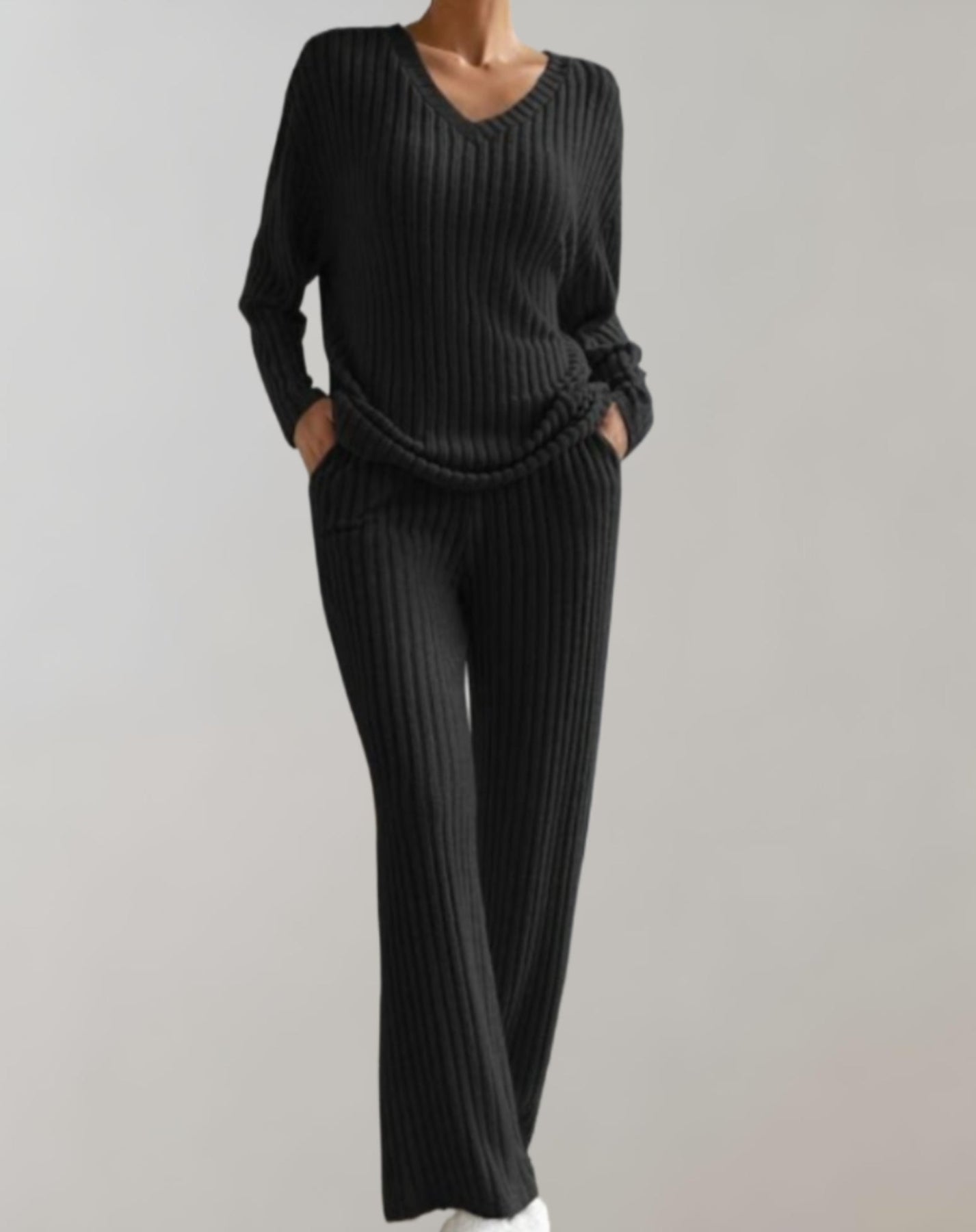 Trendy & timeless – The V-neck sweater and wide trousers create a modern, chic look