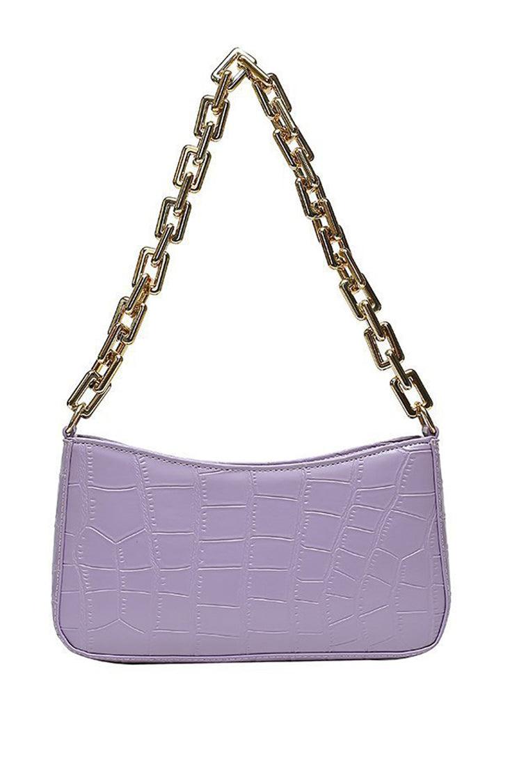 This handbag takes your outfit to a whole new level. Featuring a gold chain strap, crocodile print, and faux leather.