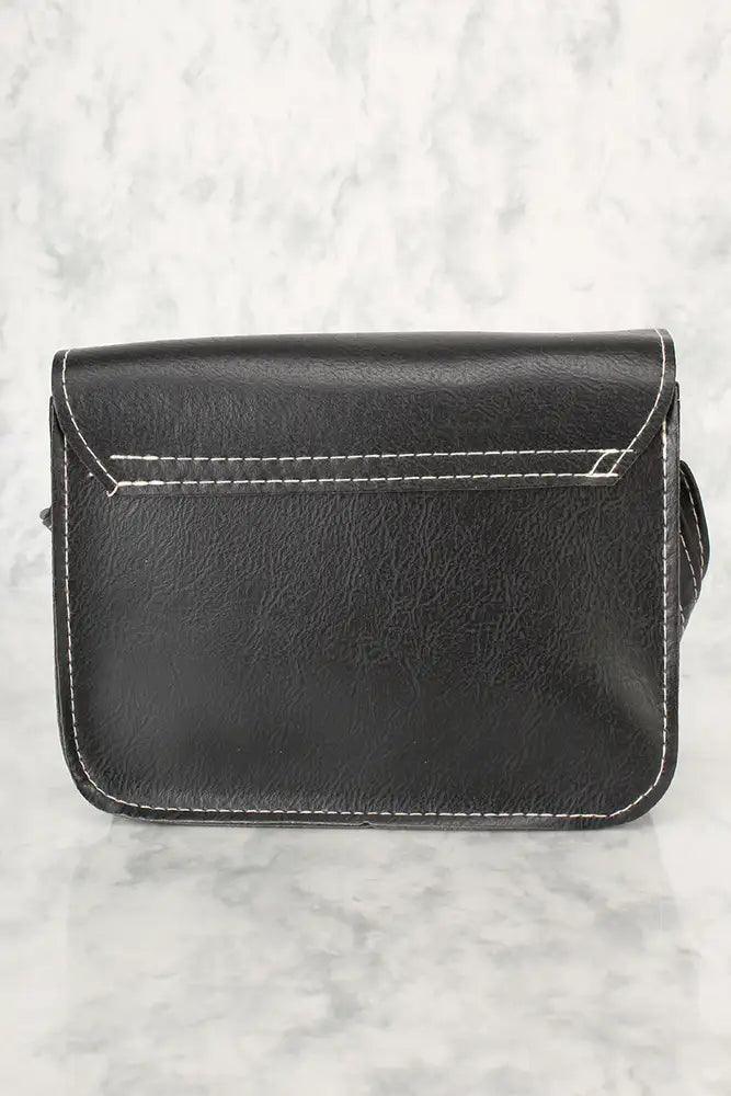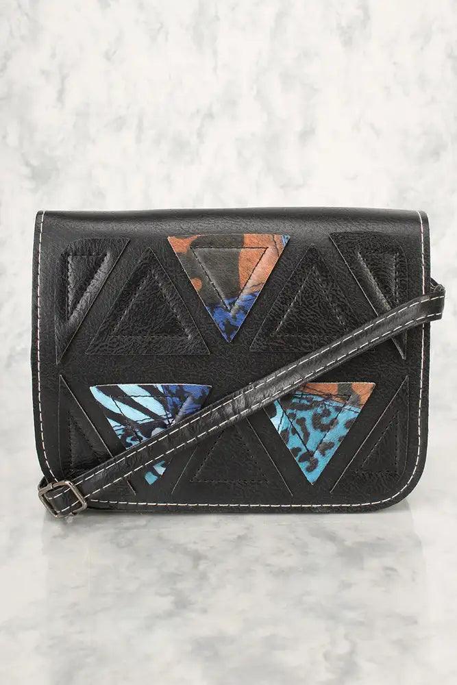 This bag is the perfect choice for a bold statement piece! Features: faux leather, animal print, embroidered geometric patches, adjustable shoulder strap, stitched trim, top zip closure, front hook closure. Width: 7 3/4 inches, Height: 6 inches, Depth: 2 inches.