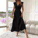 A light, feminine maxi dress is the ideal choice for warm days. This style stands out with its wrap neckline, which subtly accentuates the bust and neckline, while the elasticated waist beautifully emphasizes the figure. Short, gently flowing sleeves create a sense of airiness, while the striking ruffled hem adds a romantic touch. Perfect for walks, get-togethers, or summer parties.