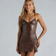 This elegant faux leather mini dress will have you ready to impress at happy hour! It features a sleeveless V-neck with a bust seam outline, spaghetti straps, a seductive open back with crossover straps and a tie closure, a mini-length hem with a sexy front slit, and an A-line silhouette. The smooth and lightweight faux leather fabric has plenty of stretch. Style this mini dress with a biker jacket and sheer heels to grab drinks with the girls!