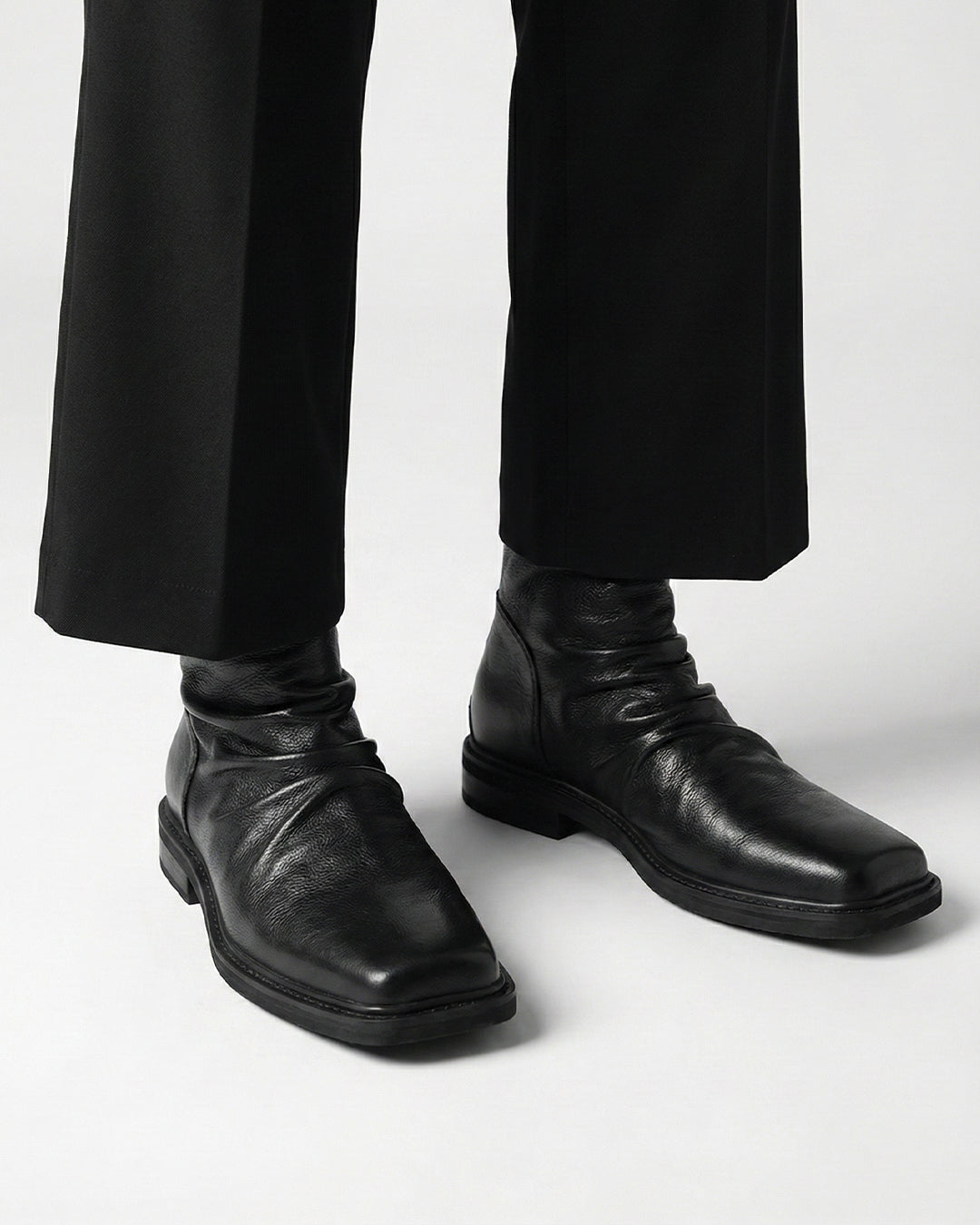 This men's ankle boot combines a bold square toe with a subtly creased silhouette for a cool, modern look. The minimalist yet bold design makes it easy to pair with both casual and more formal outfits. The ankle-high shaft and stable heel ensure comfortable everyday wear. A versatile choice for men who want to combine style and functionality.