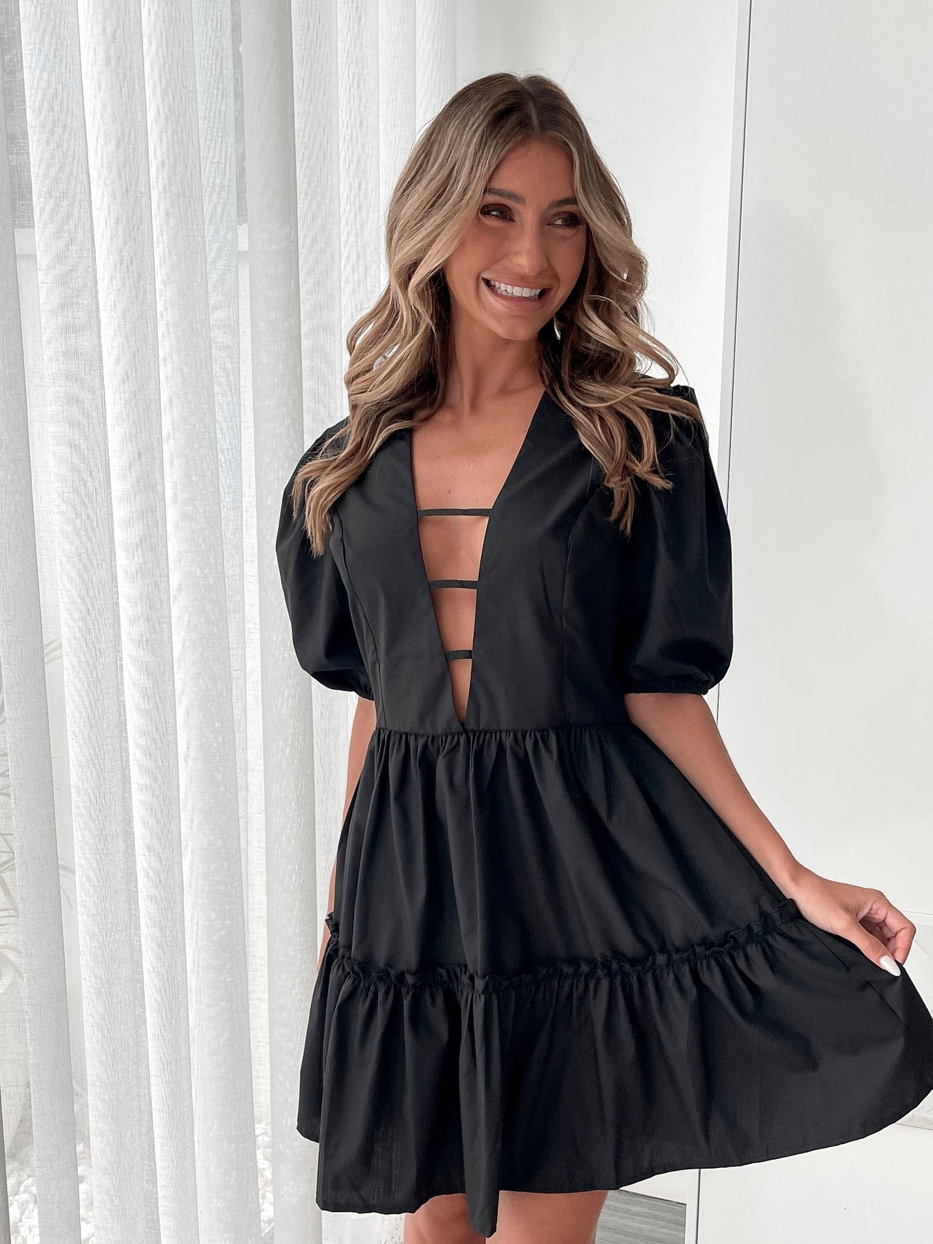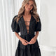 Dames | Zayenna Jurk | Zwart | V-Hals | Korte Ballonmouwen | Mini Lengte