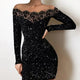 A breathtaking mini dress with a fitted cut, perfect for special evenings and occasions. The subtle lace trim at the neckline enhances its elegance, while shimmering accents add a touch of sparkle that draws the eye. The dress has long sleeves and a Spanish neckline that beautifully shows off the shoulders. Made of stretchy fabric that perfectly hugs the figure and emphasizes its full features.