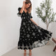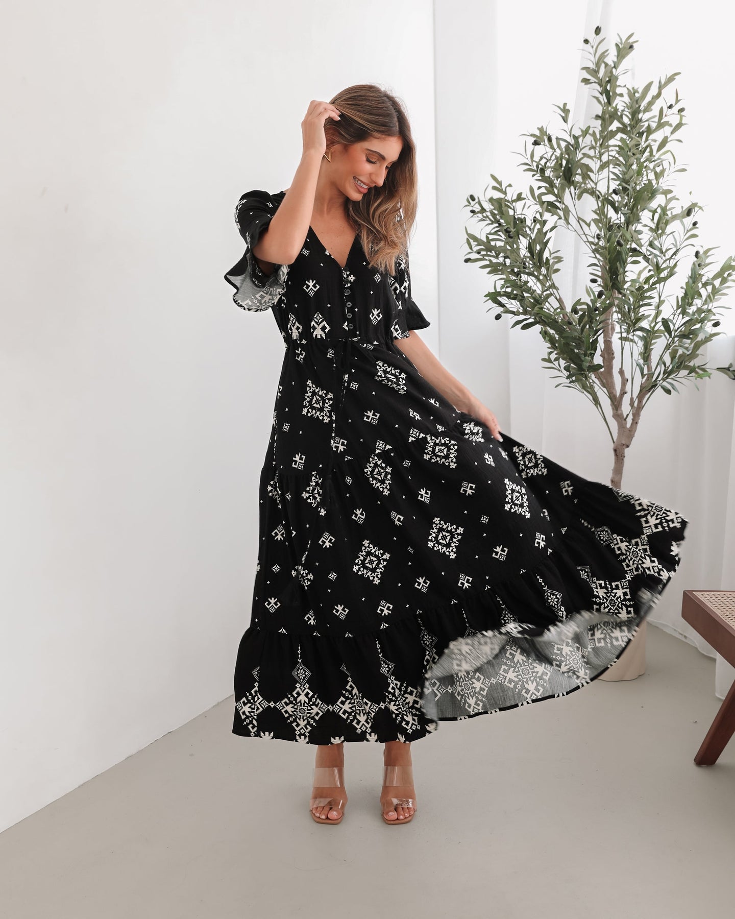 Dames | Ortensia Jurk | Zwart Print | V-Hals | Korte Flodder Mouwen | Midi Lengte