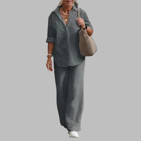 Discover the Florisa Airy Two-Piece Set – specially designed for warm summer days when you want to look effortlessly stylish. This set includes a breezy top and matching trousers, perfect for relaxing days at the beach or a casual summer stroll. Thanks to the relaxed fit, you'll stay cool and comfortable, even on the hottest days.